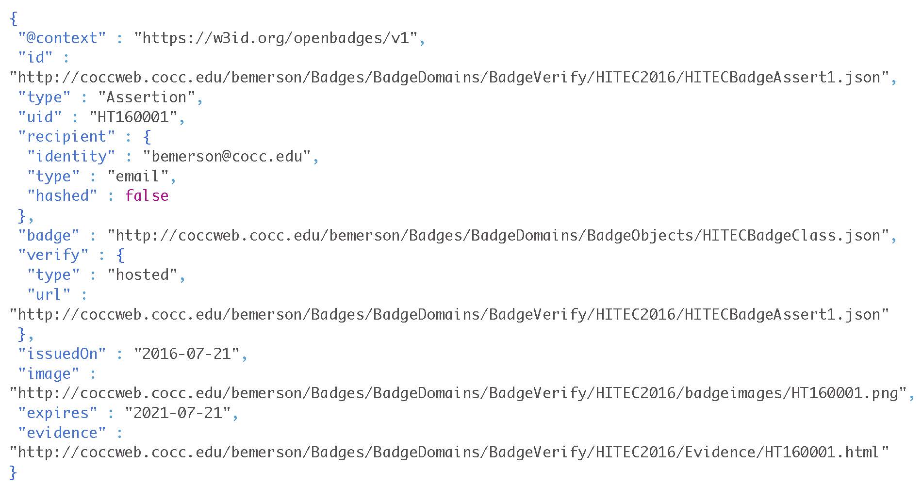 This is how the recipient of the badge will be identified. I have not personally explored the full range of possibilities here. For now the following strings are required to appropriately identify the recipient.