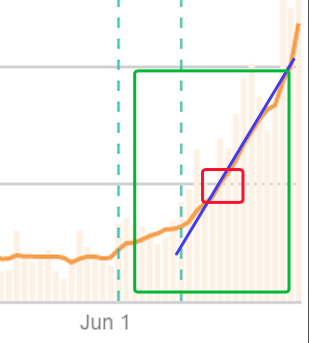 The green box is roughly the second week of June, the red box is the middle of that week, and the blue line matches the slope of the orange line at that point. The blue line crosses the gray grid on June 13 and again on June 22 (if I counted right). Looking back at the previous plot those gray lines are 2000 cases/day (lower line) and 4000 cases/day (upper line). That means my two points on the blue line are [13 days, 2000 cases/day] and [22 days, 4000 cases/day]. The math looks like this....