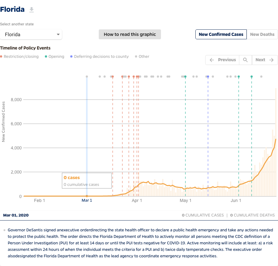 A quick reminder from our previous discussion. Another feature of every graph that I asked you to notice was the area under the curve. In this plot the area under the curve is the total number of cases between any two dates. Look at the area under the curve between April 1 and May 1. Now compare that to the area under the curve for June. I think you would have to agree that there have been more cases in June than in April though at worst maybe twice as much. But there's a difference, if you imagine what might happen in July. July will start with somewhere around 4000 cases/day and even if Florida manages to stop the increase in the number of daily cases there is little evidence that it will drop quickly. That suggests that July is going to be a very important month to watch for Florida and it is likely to be very challenging for them.