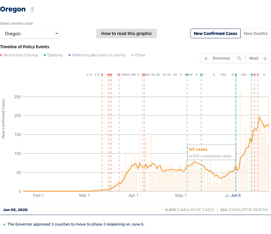 Above is the Oregon COVID case data through 6/27. Calculate the slope of the curve the last week of March and the second week of June. It's tough to compare two states like Oregon and Florida because they have very different populations. Oregon has a population of 4 million (40 x 100,000 = 40*105) while Florida has a population of 22 million or 220*105. If you divide your Oregon slopes by 40 and our Florida slopes by 220 you get the rate of increase per 105 people. It's not a perfect comparison but it does suggest which state is being more challenged. You will be asked for these population corrected slopes in the quiz.