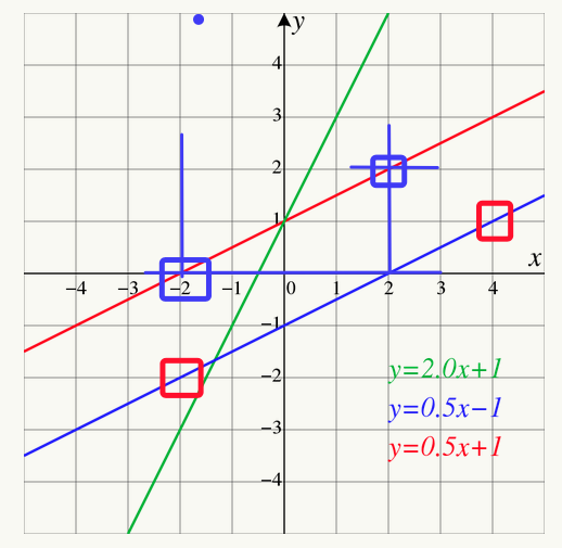 We generally assume that if the slope is positive the line is rising to the right and if the slope is negative it's falling as the plot moves to the right. Use the points boxed in the red squares to show that the slope of the blue line is also +0.5. Notice that the red and blue lines are parallel which means we expect them to have the same slope. For practice you can pick two points on the green line and determine the slope (+2.0 should be your answer)