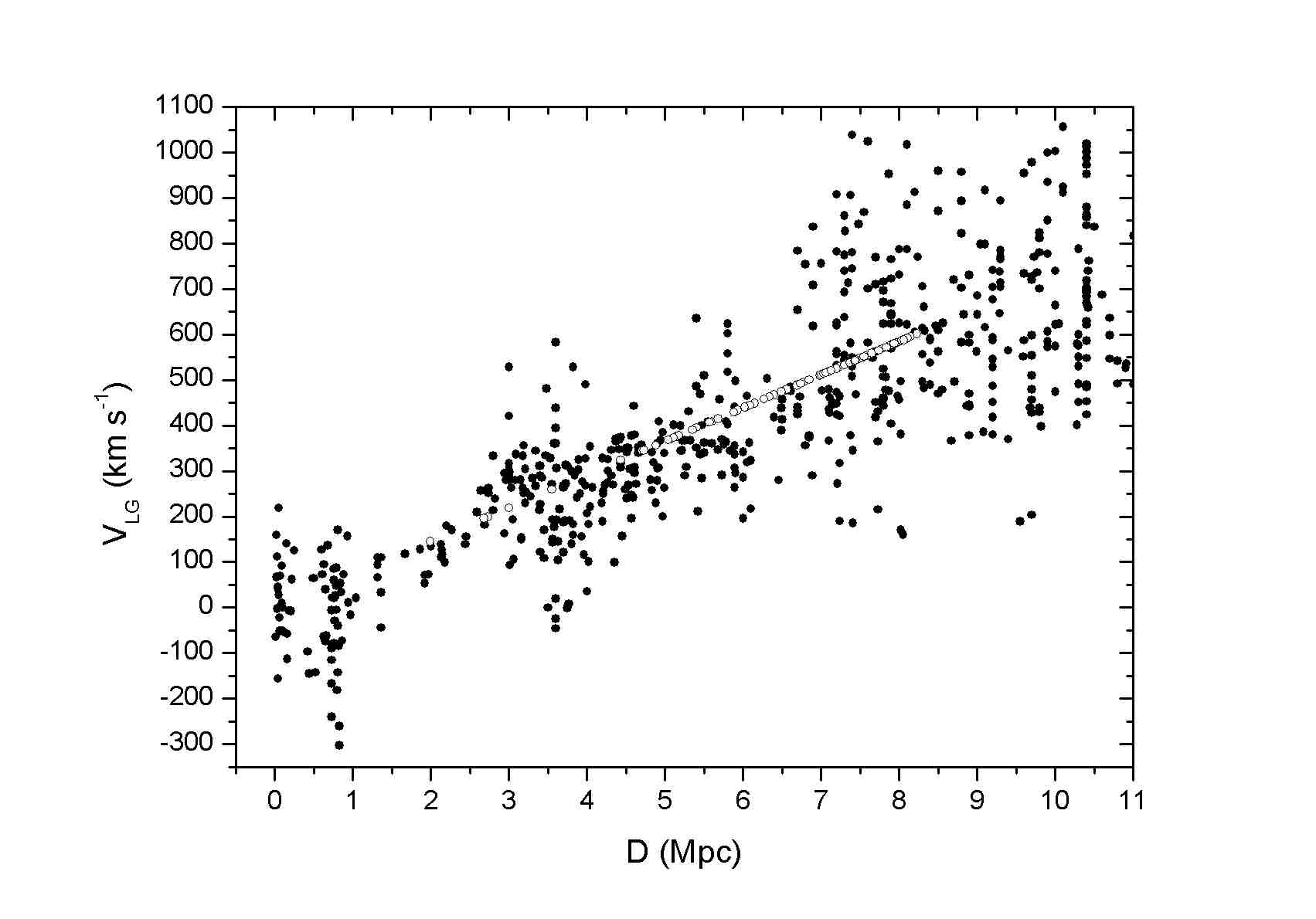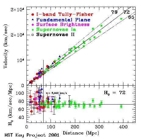 Like all real data it doesn't look particularly well behaved but there is a definite trend up and to the right. Remember that on this scale our nearest large galaxy (the Andromeda Galaxy) is 0.8 Mpc away. Over time we have used the distance tools we previously discussed to tighten up this distribution so the trend is more crisp. We now have a much richer picture with data that goes out much further.....