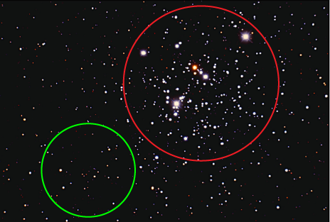 - Within this image are stars that are part of the cluster as well as stars that are 'behind' or 'in front' of the cluster. These stars are called field stars. The main cluster is roughly within the red circle and the stars in the green circle are probably only field stars.