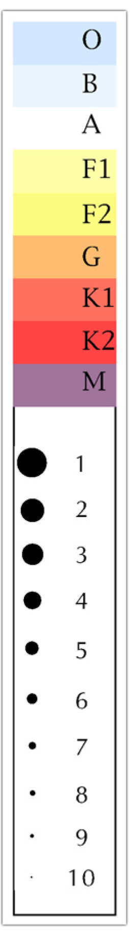 Commentary: Begin by printing off the work sheet. The size of the star is plotted along the vertical axis and the color of the star is plotted along the horizontal axis. The color of the star is most evident on it's edges. In a f2f class I normally put the images in a plastic sleeve so it's easy to put a marker dot on top of stars that have been classified and counted. You can do this if you're working independently as well. If you are working digitally on a screen I am thinking that you can use the bottom of your window to slowly move up through the part of the image that you have boxed or circled trying not to lose track. Just give it your best effort. For those working on this digitally you will need to make sure the reference scale is the same height as the short side of the image or the size of the reference dots will not be correct.