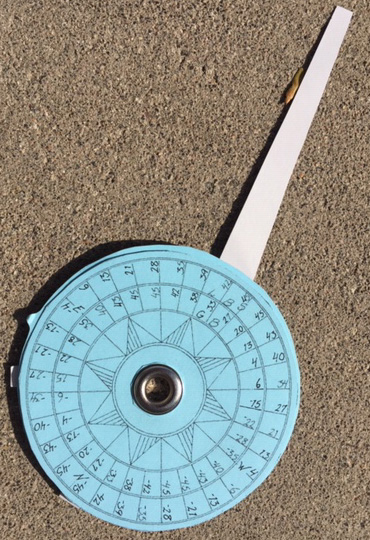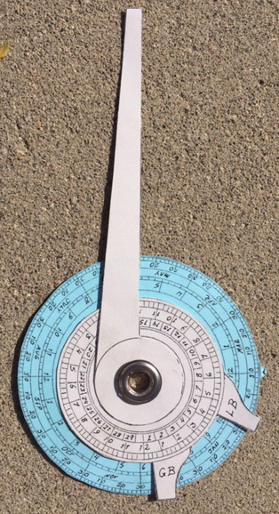 Since this is a construction project the procedure begins with a just the process of cutting out and assembling a simple nocturnal. Here is a link to the pdf file I created and printed out on light card stock for this lab. I provide it here in case you every want to make another one or perhaps an engraved brass one for yourself:) My thanks to Dennis Fischer and his book - Latitude Hooks and Azimuth RIngs for the underlying graphics..