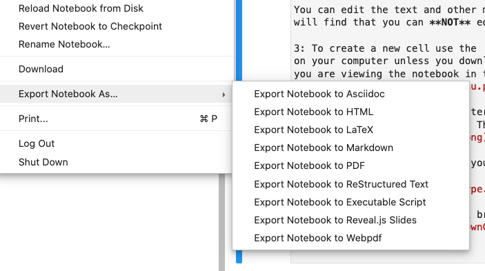 NOTE: It has been observed that Chrome and perhaps Safari need to be actively connected to the network in order to render the HTML export correctly. Look at your math formulae after you export the notebook and if they still look like markdown language check your network connection. (Thanks to Cathy '19 for this insight)