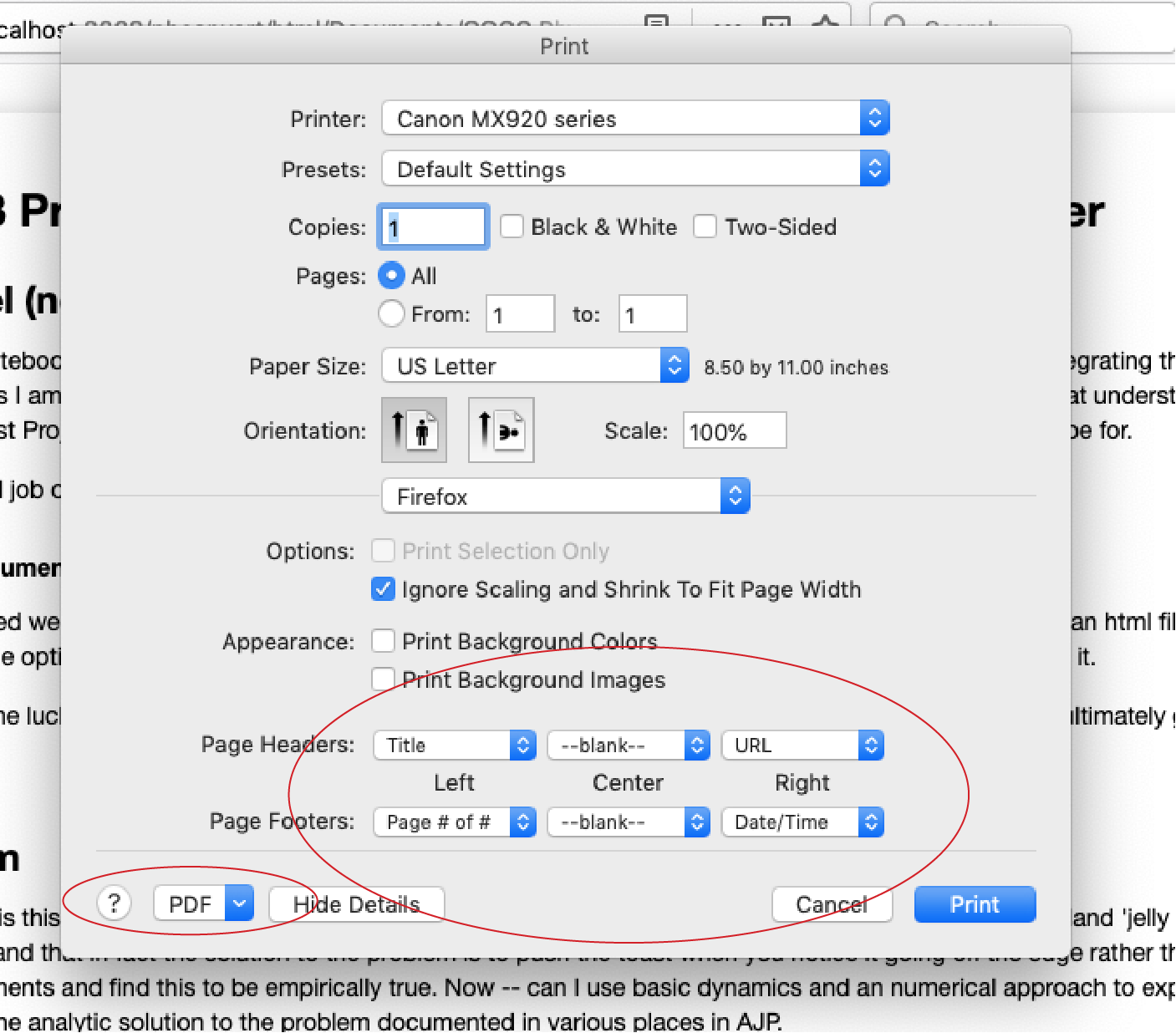 3) This is where it gets a little different for the Windows and iOS machines. In iOS at the bottom of the print window there are header and footer options. If you don't see the header and footer options 'Show Details'. Set them all to blank. Then select Save as PDF from the dropdown menu in the bottom left corner. That's it!