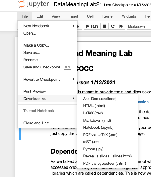 When you want to export your notebook to a pdf format the process starts a little differently. In the file menu illustrated below there is a 'Download as..' menu. Choose HTML and Notebook will download the file in .html format AND open it (perhaps in a new window) in your browser. From there the directions to print to .pdf are the same as in Jupyterlab.