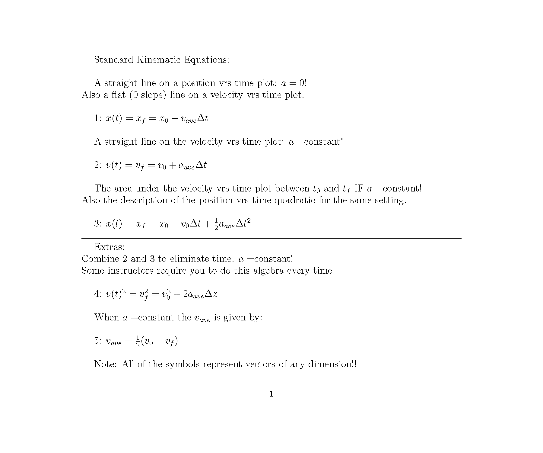 4. Consider which of the “kinematic equations” apply in your circumstance. A complete list is at the bottom of this document. From those that apply choose an equation which contains the variable or information you are seeking. If in doubt try any applicable equation and see what it tells you. As you write down an equation to try note which variables are known and which are not. At least initially you can hope that you will find an equation that has only one unknown and is hence solvable. You may find that figuring out stuff with the graphs is easier but make sure you can see how the math can take you the same place.