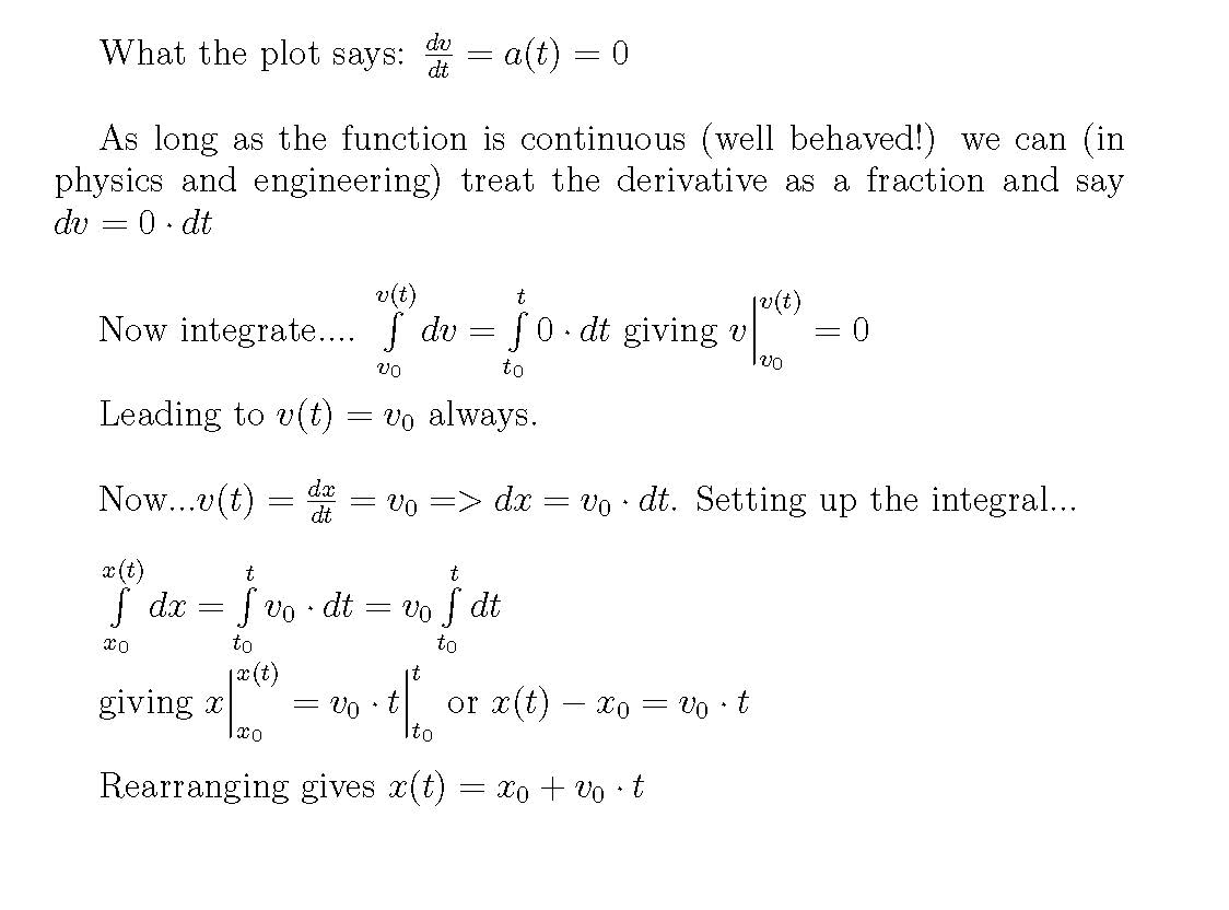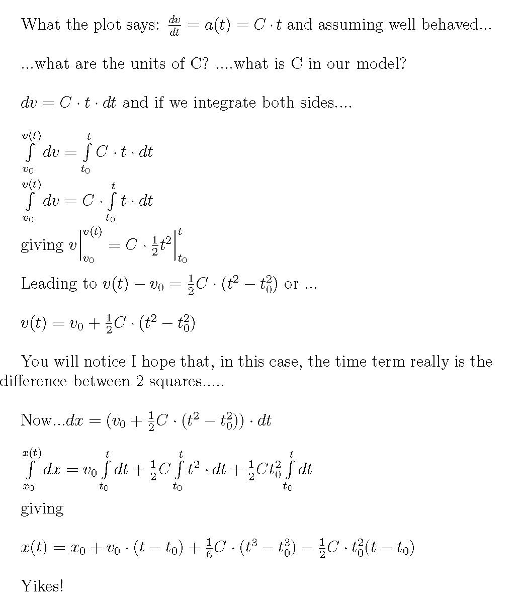 For this class I don't need you to be able to reproduce the integration processes illustrated below. I want you to see them because, ultimately, this is how we actually solve physics and engineering problems. We start with the acceleration function and integrate it. Many of you are in MTH 252 and you will see some or all this integration process soon. I want to have an awareness of how it is connected to the physics. Some of you already have some basic integration skills and I want you to see how integration works in an applied setting.