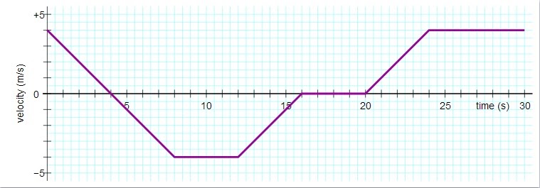 There are 5 intervals on this graph representing different behaviors of an object. For each interval determine the velocity and acceleration of the object as well as the distance traveled. Be careful about units.