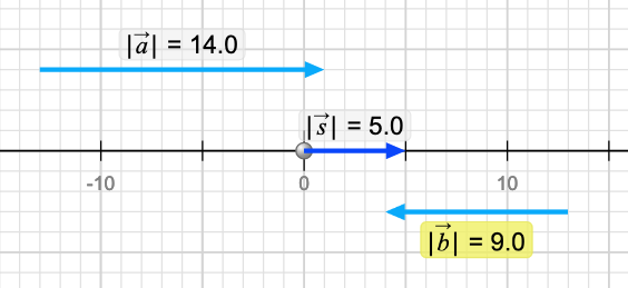 Mathematically this may seem totally obvious since 5 = 14 + (-9) and that is good. This is in fact how it works in 1D. s is called the resultant vector which is labeled s for 'sum' in this case. The notation for this is s = a + b! Notice that the result doesn't depend where you drag the two vectors on the page. Hopefully this reinforces the idea that vectors aren't attached to any particular place.