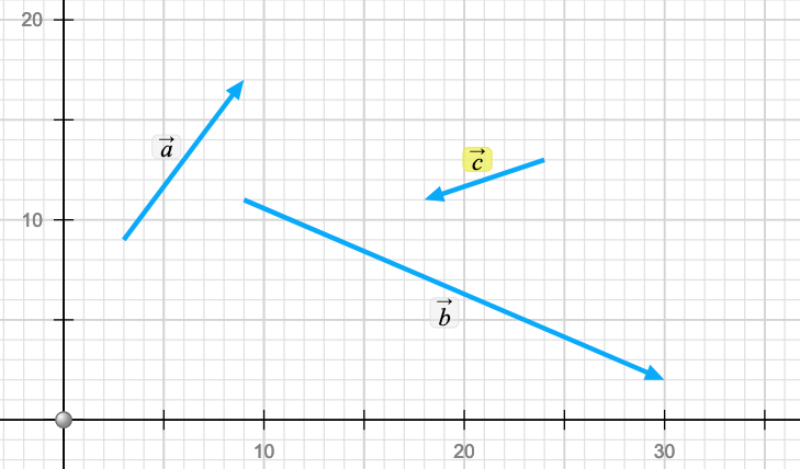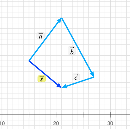 Let's return to the PhET simulation and move to the 2D exploration tool. Grab three vectros from the tool bar and drop them anywhere on the grid. Ideally 3 different lengths and directions. Once you've dropped them on the grid add them up using the tip to tail method. Show that A + B + C = B + C + A = C + A + B etc etc (I've replace the lower case vector names with upper case for clarity). This means the end of your chain is the same distance from the beginning of the chain in each case. Here are my vectors..