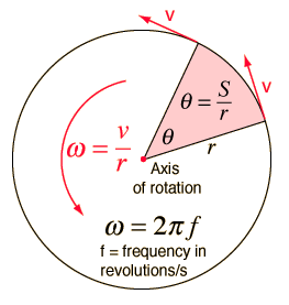 If we now consider an object that is rotating we will notice the following relationships the angular variables and the tangential velocity of a point on the edge. In this graphic S is the arc length (distance) that the edge has traveled in some time. θ = S/r is the definition of the angle θ in radians. The velocity vector describing the motion of a point on the edge is tangential to the path of that point and, as we saw in circular motion, is always changing direction.