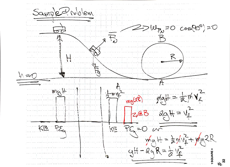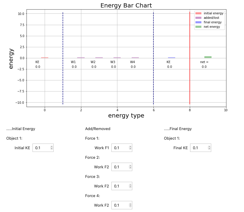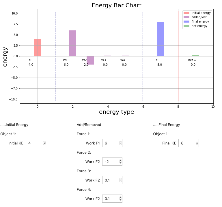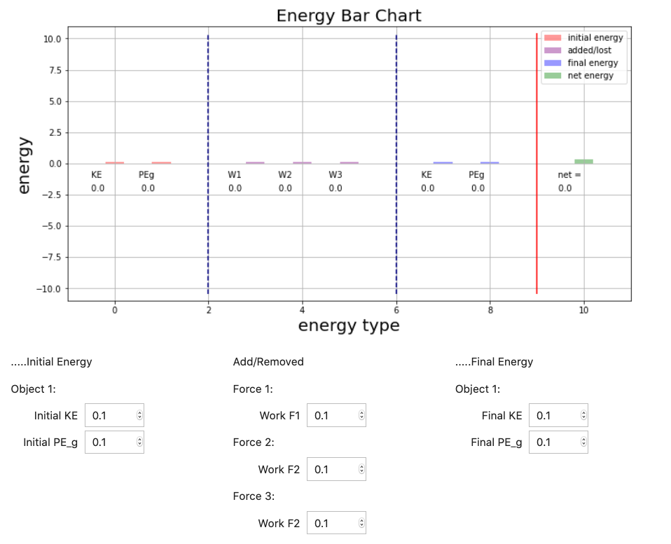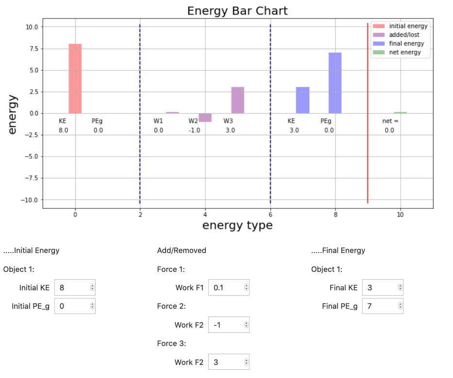 In this representation of the energy in the system every force on our freebody diagram (FBD) is represented by a bar UNLESS we can explicitly argue that it neither adds nor removes energy (the normal force is often an example). The 'height' of each bar can be determined and then the equation that describes the system can be written from the bar chart. All of the previous HW problems could have been represented with this bar chart.