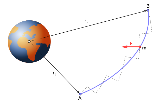 Any path between A and B can be represented as a series of 'steps' that are either perpendicular or parallel to the force of gravity. The total energy moved by gravity as I move an object from A to B will be the sum of the energy moved in all the parts of the path. Notice that on the sections of the path where the force of gravity is perpendicular to the path no work is done. This is because cos(90o) = 0 as we discussed previously. Only the parts of the path where we move closer or further from the center of the earth 'do work' or move energy. The energy moved must depend only on r1 and r2, the end points, and not the path from A to B.