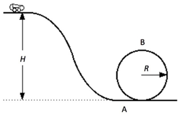 Revisiting a problem from the previous HW set. Imagine that you placed a spring at the bottom of the loop facing the incoming vehicle. Give the mass of the 'vehicle' is 15 kg, the spring constant for the ideal spring is 1200 N/m, and the height of the starting point is 2.5 m. How far will the spring be compressed before the vehicle is brought to a stop?