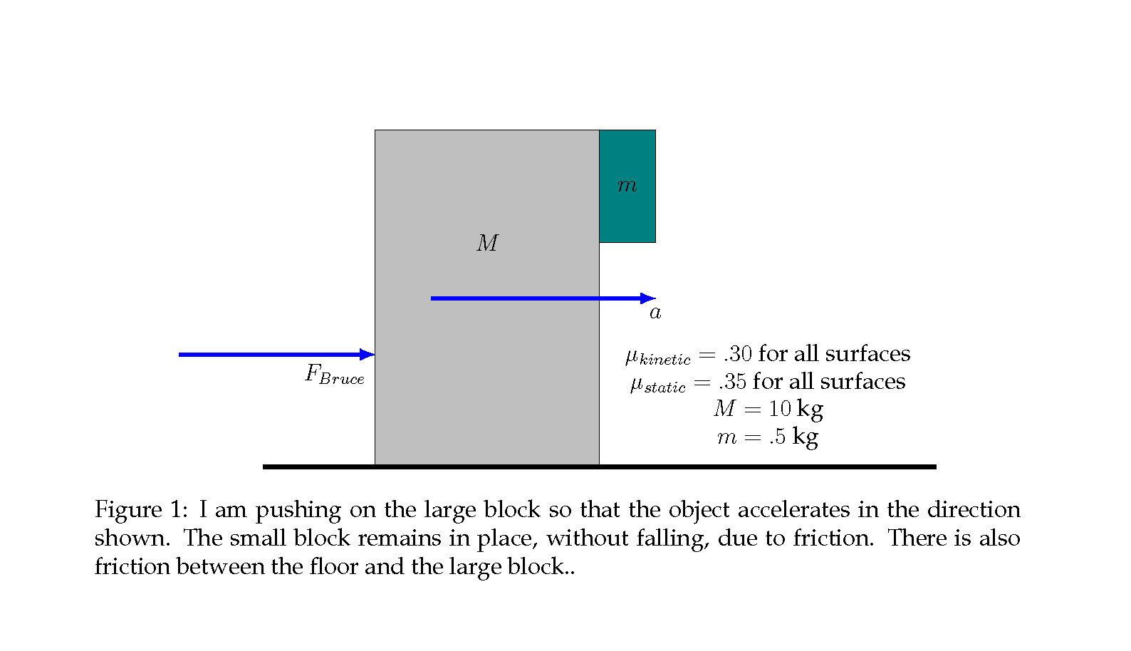 This is a variation of a classic physics friction problem. The question is essentially what force do I need to apply in order for the small block on the front to remain in position due to friction only? This will require a thoughtful application of Newton's 3rd Law along with careful interpretation of your freebody diagrams. Big sketches and organization will be expected. I'm interested, as always, in how you solve it not what the answer is.