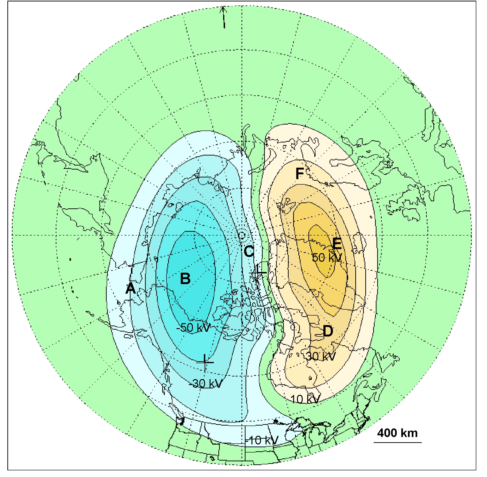 Shown below is an equipotential map of the ionosphere of the earth (thanks NASA!). From the data presented sketch the E field and determine the magnitude and direction of the E field at C and D. Be careful not to confuse the edge of the earth with an equipotential. Based on the data which source charge is larger and why? Which charge is (+) and which is (-)