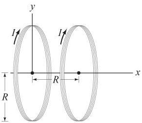 Two coils of 5000 turns are facing each other with the same current (20 A) in each coil is known as a Helmholtz Coil. The radius of the coils is 10 cm. If the coils are place parallel 20 cm apart find the B field at the midpoint between the coils. A sketch would be a brilliant idea:)