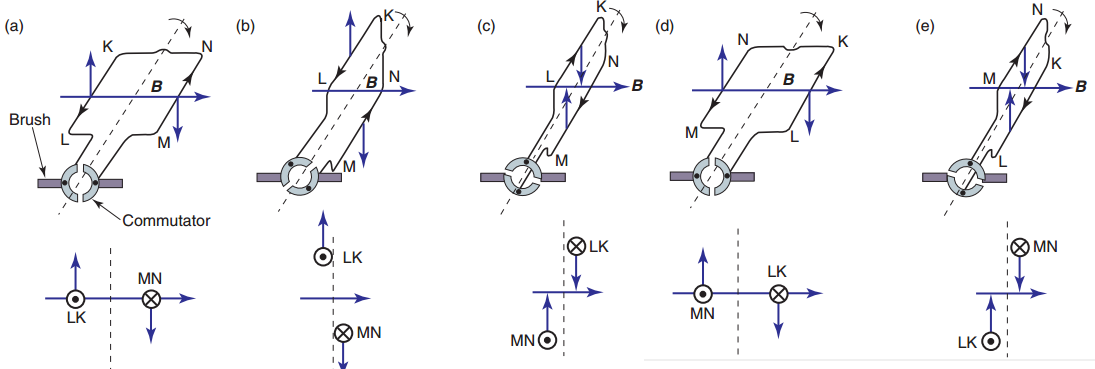 Assume that the current continues in the same direction as the coil reaches the orientation shown in (c). What does this actually mean? Notice the currents shown in (c) are reversed from the previous frame. The commutator is what causes this. In examining this portion of the sketch can you articulate a reason why we would want to reverse the flow of current through the coil?