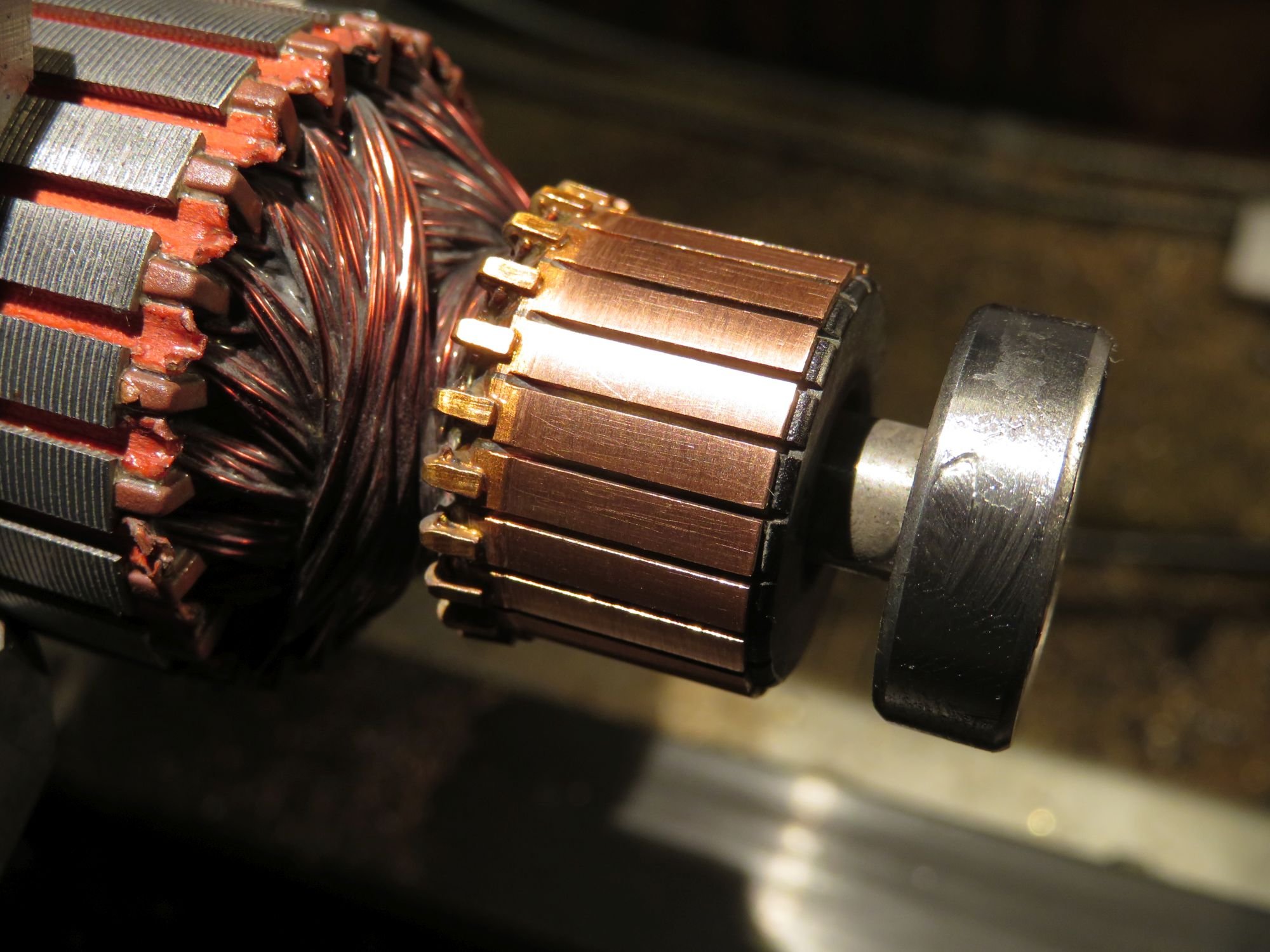 At this point, hopefully, you can see how a DC motor generates a torque that keeps the coil rotating in the same direction. Without the commutator to reverse the current the coil would just waggle back and forth and not rotate. Did you also notice that the magnitude of the torque (rotational force) varies from a maximum to a minimum as the coil rotates to different orientations? For this reason motors usually contain a number of coils with different orientations to keep the overall torque more constant. Each coil needs it's own commutator. The following image will give you a sense of this.