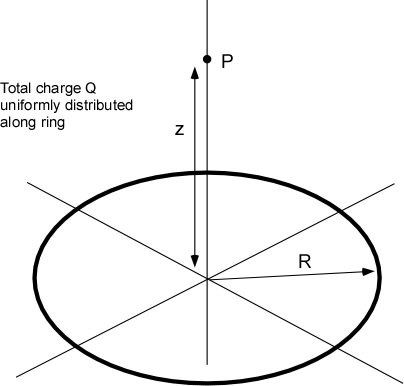 9) (Integration) A total charge Q (5 mC) is distributed uniformly along a ring of radius R = 6 cm. The ring lies in the x-y plane with it's center at the origin (see below) second charge of 10 mC is located at point P 20 cm up the z axis. Take the time to draw yourself a picture and work thoughtfully through the setting up process we talked about in class. Determine the force on the 10 mC charge from the ring of charge.