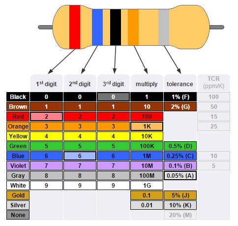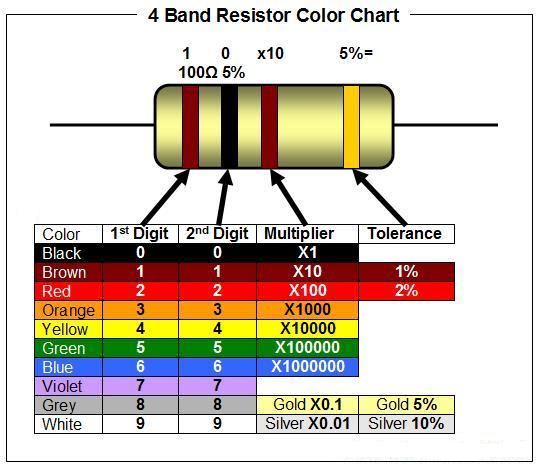 There are a number of tools that would be handy for this lab. One of these is the Resistor Color Code chart. Resistors have clever little colored lines on them that tell you what the resistance is. Mostly we just measure them with a DMM (see below) but in case you need them here they are.