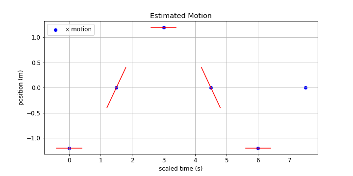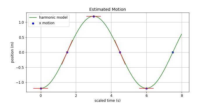 This is a good point to think about what the actual times and distances are in the video clip. When I made a rough estimate I found a cycle time in the horizontal direction of 5-6 seconds and the total range of motion feels like it is between 2 and 3 m (not sure why I feel that way). Taking 6 seconds as a nice number that means each quarter of the cycle is 1.5 s. If I take the full range of motion to be 2.4 m then the pendulum moves 1.2 m each way from the 'neutral' position.