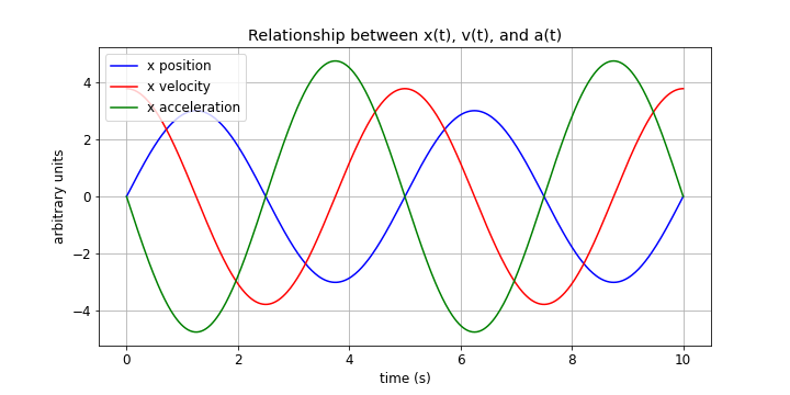 Here is what all of this looks like graphically. Use the values from the blue position function to calculate the amplitudes of the velocity and acceleration plots -- check that it makes sense!