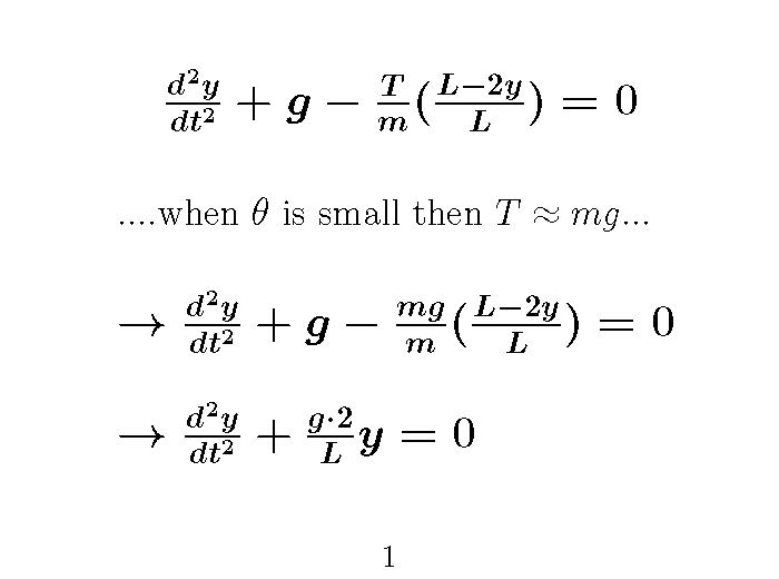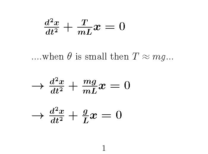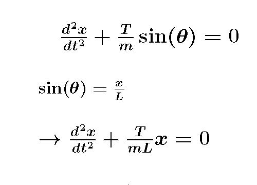 It is important to understand that in applied sciences (engineering) and often in physics we will make simplifying assumptions to see if we can gain some insight into the 'problem'. This very similar to what we did when we neglected air drag when we did those projectile problems back in PH211. In this case one could argue that as long as the angle is small cos(θ) ≅ 1 which means since T cos(θ) = mg then T ≅ mg under these circumstances- yikes! Let's see what happens if we make this approximation....