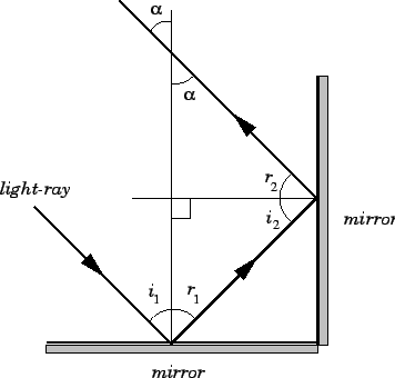 Imagine two (2) flat mirrors at perpendicular to one another (like a corner in a room) and both perpendicular to the floor. Show that light traveling parallel to the floor is reflected around the corner and returns travelling parallel to it's original direction.