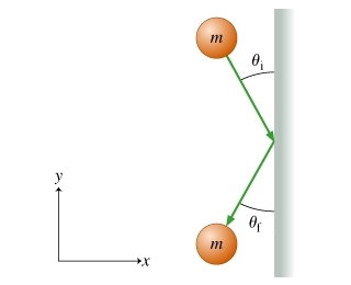 Because the colllision is assumed to be elastic and the wall is stationary after the collision that means the velocity of the ball must be the same before and after. The momentum is conserved as long as there are no unbalanced external forces -- important to remember! In the y direction, assuming no friction, there is no force therefore vy is unchanged. If vy is unchanged and v is unchanged that means the magnitude of vx is unchanged. Be careful, the momentum in the x direction DOES CHANGE because the ball has been smacked by the wall in the x direction! The only way all of those statements can be true is if θi = θf . In the mechanical case we think of θi and the initial angle and θf as the final angle. In optics we think of them as the incident angle and the reflected angle.