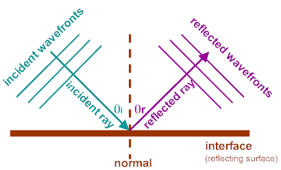 In MTH254 (Vector Calc) you will find that we mathematically define the orientation of a plane (flat reflecting surface) using a vector called the normal. As you will remember from PH211 the normal force is a force in the direction 'normal', i.e. perpendicular, to the surface. In MTH 254 and optics the normal is a vector or line perpendicular to the surface. Because of it's mathematical importance we measure the angles of incidence and reflection relative to the normal rather than the plane of the reflecting surface as illustrated below.