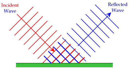 We can think about the reflection of plane waves from either a wavefront representation OR a ray representation. To understand why waves reflect from flat surfaces as they do it is helpful to consider how a particle 'reflects' off a wall. Since light at least is both a wave and a particle this is a reasonable approach. Consider this image of a ball bouncing elastically off a rigid wall.