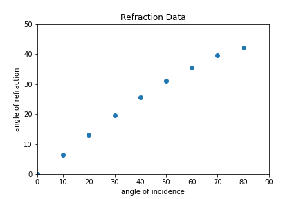 The specific relationship between the angle of incidence and the angle of refraction is not particularly clear. Here is what the plotted data looks like for a particular case. Not linear except when the angles are small.