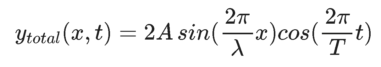 So now we have the idea that two waves of the same frequency and wavelength (only one is needed since the speed of the wave must be the same and forces the wavelengths to be the same if the frequency is the same and vica versa! - do you understand this?) traveling in opposite directions create a wave pattern that has the shape of a wave but doesn't go anywhere hence the name 'standing wave'. You can see this by noting that a value of x for which sin(kx) = 0 will always be zero regardless of the time and that means y(x,t) will always be zero. Can you find these points in the animation? Similarly, at some values of t the cos(ωt) = 0 which means y(x,t) = 0 everywhere along the x direction (it looks flat). Can you see this in the animation?