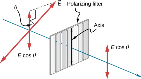 Notice that θ is the angle between the plane of polarization of the light and the transmission axis of the polarizing material. When θ = π/2 no E field gets through (cos(π/2) = 0) and when θ = 0 all of the E field gets through (cos(0) = 1). Now it just slightly more complicated because the intensity of the light actually depends on the square of the E field which means: