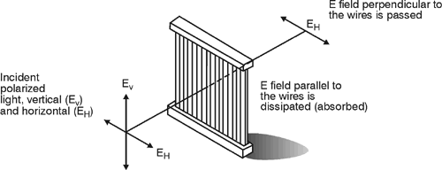 This is a chance to tie together some ideas from PH212 and PH211. Since the grid of wires is arranged vertically then when the electric field of the incoming light is aligned with the vertical axis it will produce a force (F = qE - PH212) that pushes electrons along the wires (a force applied over a distance moves energy from the E field to the charge). Because the wires have resistance this will take energy from the vertical E field (energy bar charts - PH211) and reduce it's amplitude (making that portion of the light dimmer). Light which has a horizontal E field pushes on the electrons in the wires but because there is no movement of the charge in that direction (think about why normal forces rarely add or remove energy from objects (PH211) no energy is removed from the horizontal E field and that light passes through the grid undiminished. Reread this section until it is clear to you why this is reasonable given all of the physics you know. This is a very nice integration of many concepts we have studied and the thinking it represents is more valuable than the answers you will calculate shortly.