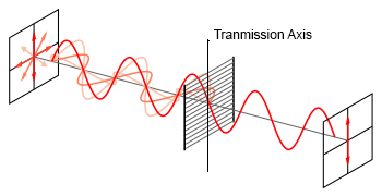 Now consider this representation of randomly polarized light passing through a grid of 'wires'. In an ideal polarizer only the light polarized perpendicular to the wires will pass through and all other polarizations will be gone.
