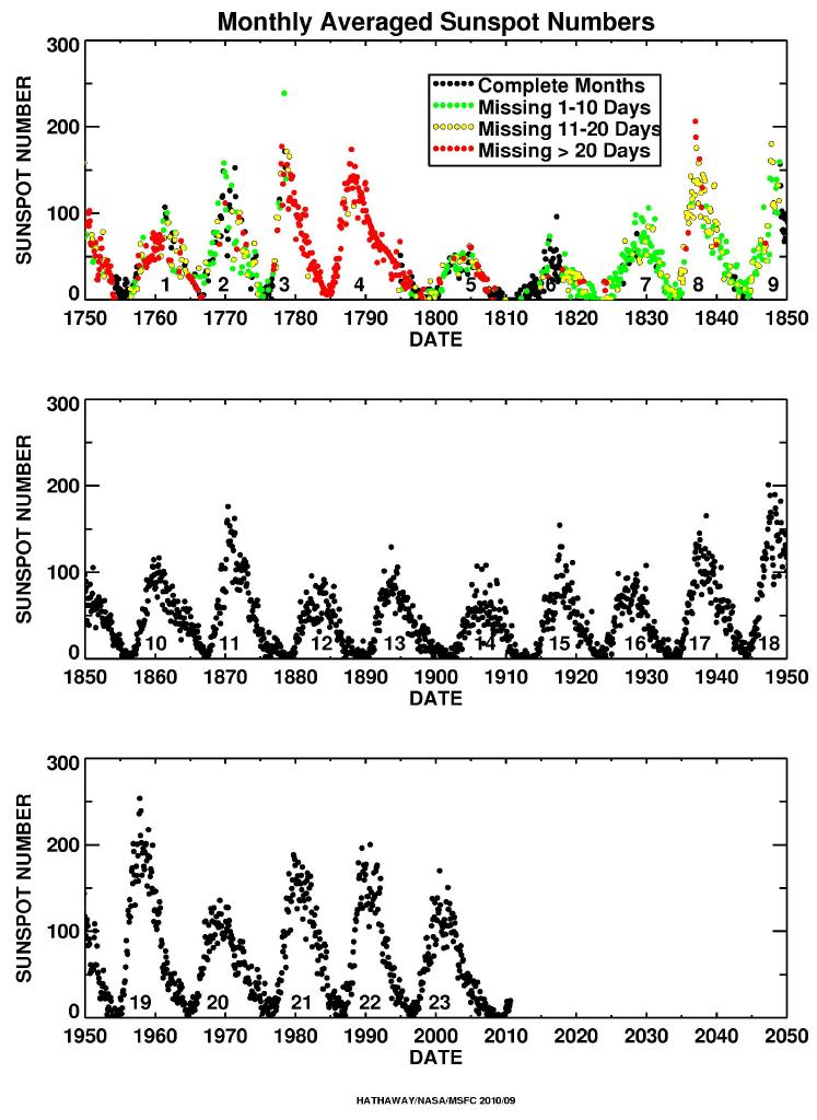 4) Consider this sunspot data. While it may not be perfectly periodic how would you best model it as periodic behavior? Think about what you have to do to deal with 0 sunspots NOT being the equilibrium state of the graph. You will need to decide when to set your time equal to zero. You will also need to make a decision about how to deal with the inconsistent "amplitude" of this periodic behavior. Do this both for the period from about 1880 - 1920 as well as the period from 1960 to the present. Are there differences and if so what are they? Exchange your model with a friend in the class (different person from problem 1) and use the new model to calculate the years of sunspot maxima between 2040 and 2060.